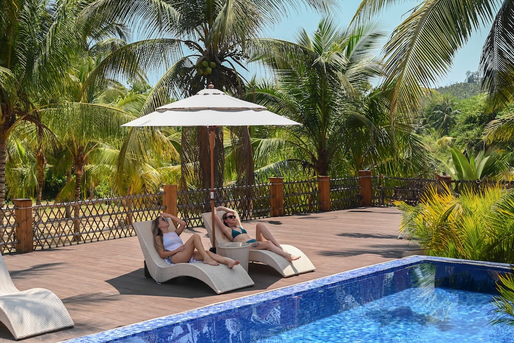 I recently placed one on my own patio — positioned perfectly between the dining table and the pool. The effect was instant. The color echoed the light tones of my stone pavers, the sleek frame matched my aluminum seating, and that gentle built-in breeze created a subtle movement that brought the space to life. It felt like the kind of design moment you only get at a Caribbean resort, except it was right at home.