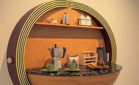 The Spherical-shape drink cabinet was inspired by a spinning coin , and the wall-mounted Dime cabinet has an hemi-spherical shape that creates the perfect furniture for a home drinking bar. It also has a standing desk and a small kitchen space with some curved segmented panels that surround the inner panels for more space and convenient. The furniture comes with some side units with smooth collapsible design.